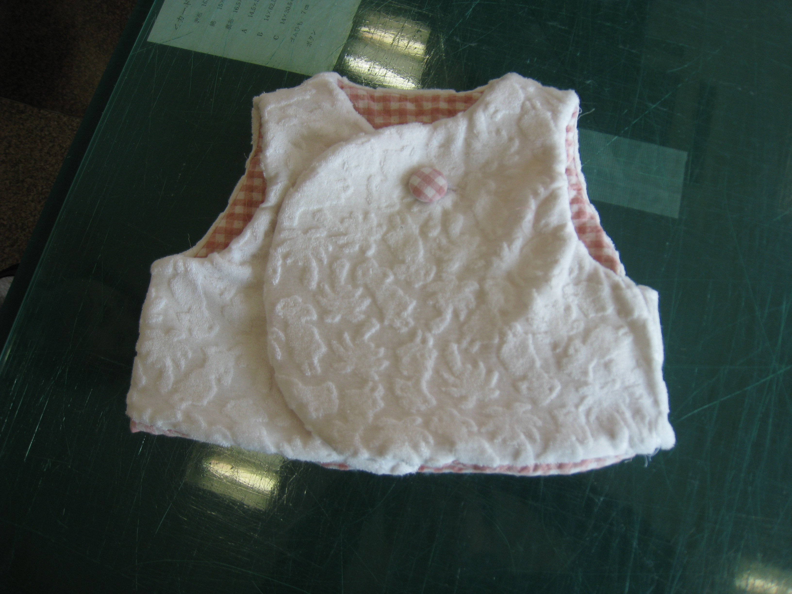 出来上がった『ベビーベスト』は白とピンクの優しい色使いで、周りの皆さんからも