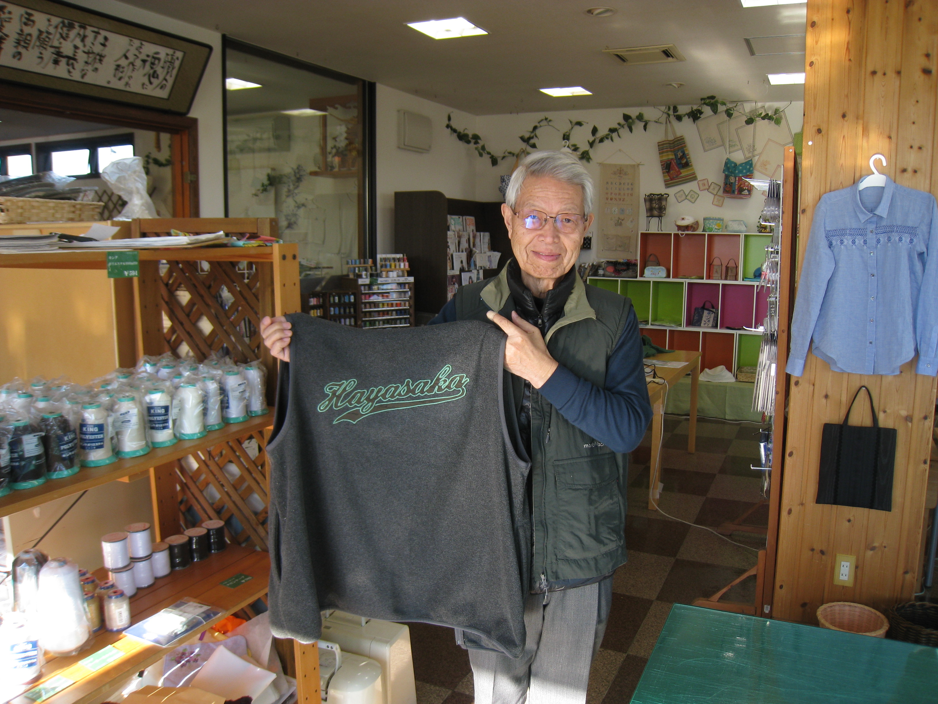 朝一番で、早坂さんが刺しゅう入りのベストを見せてくれました。ベストの背中に