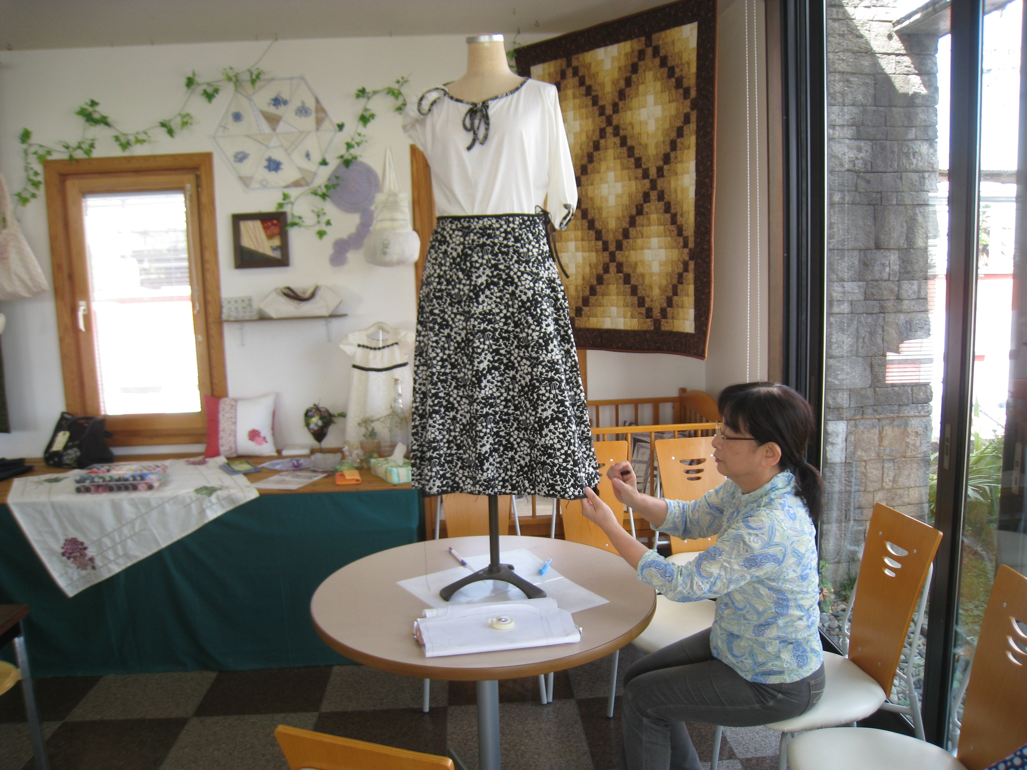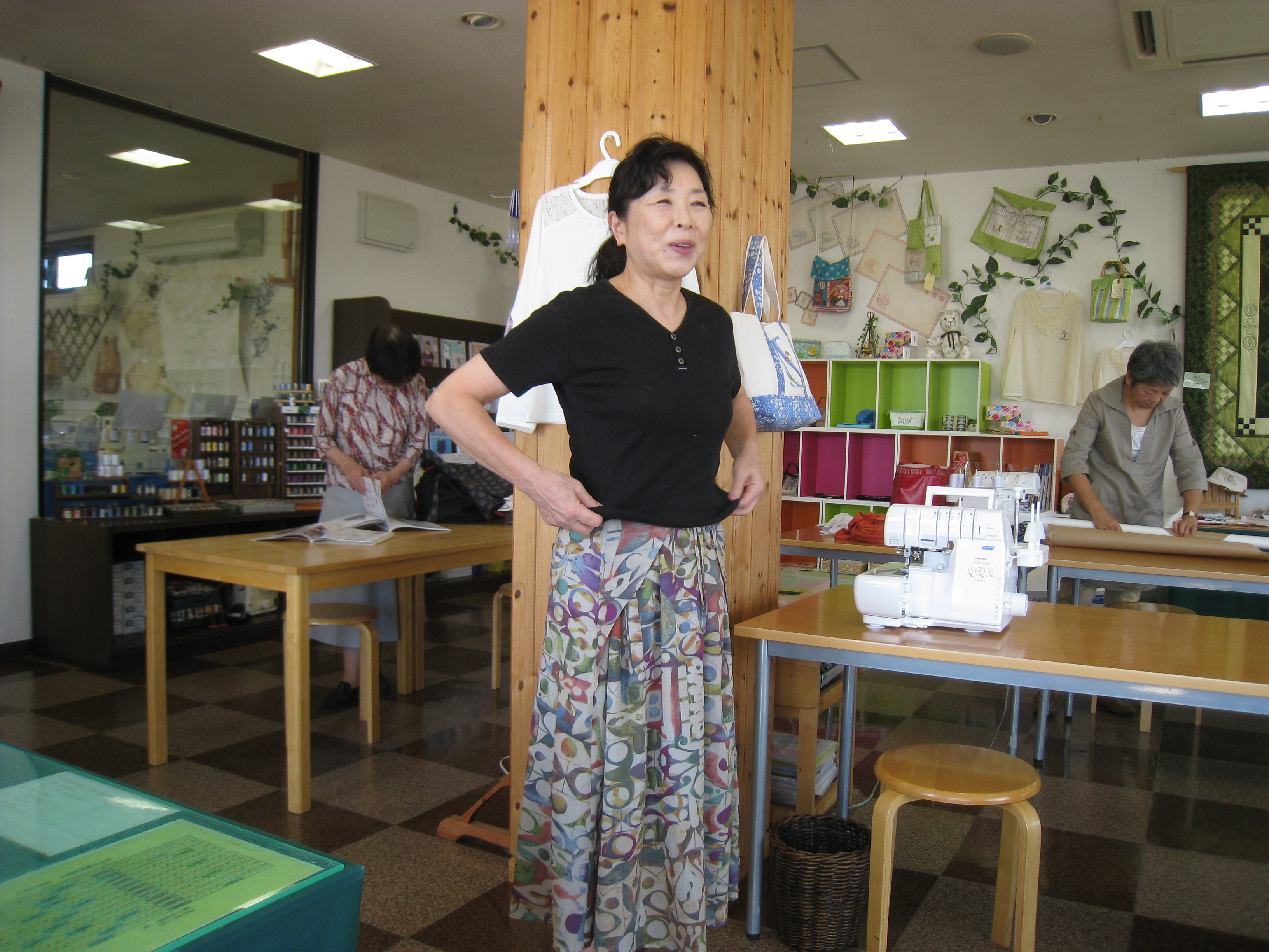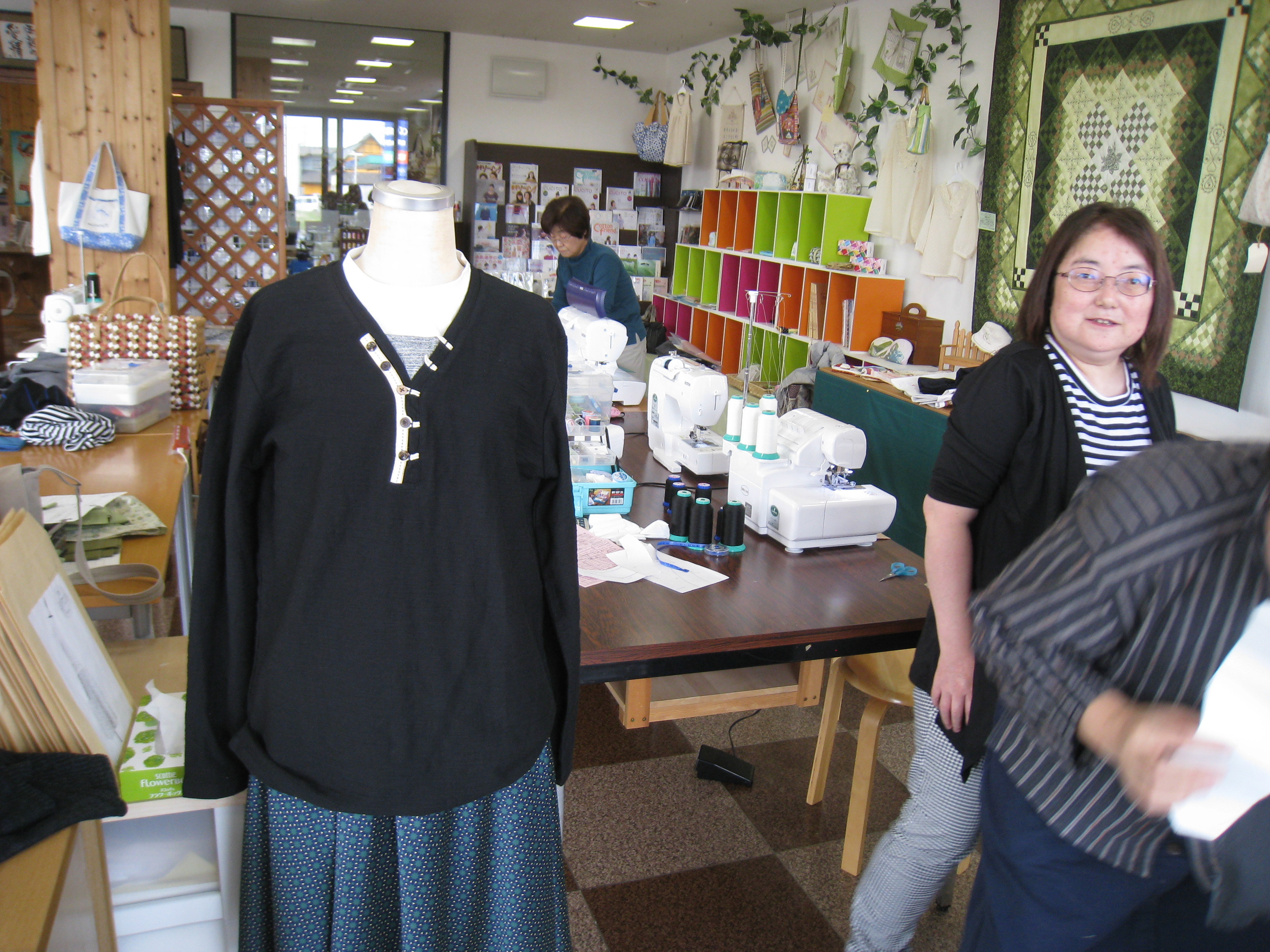 上西さんは自作のスカートを穿いて、久美子さんは自作のカーディガンを着て来店。