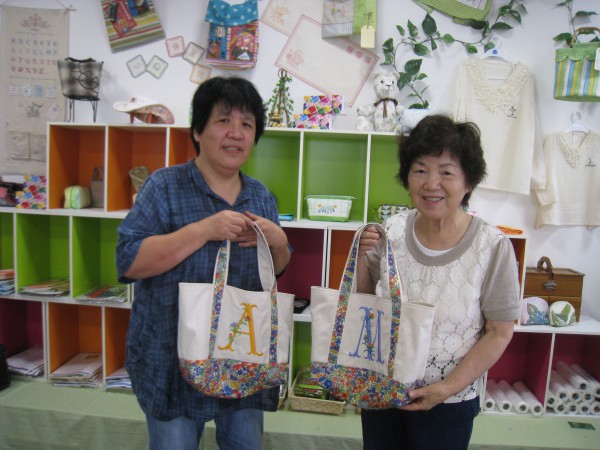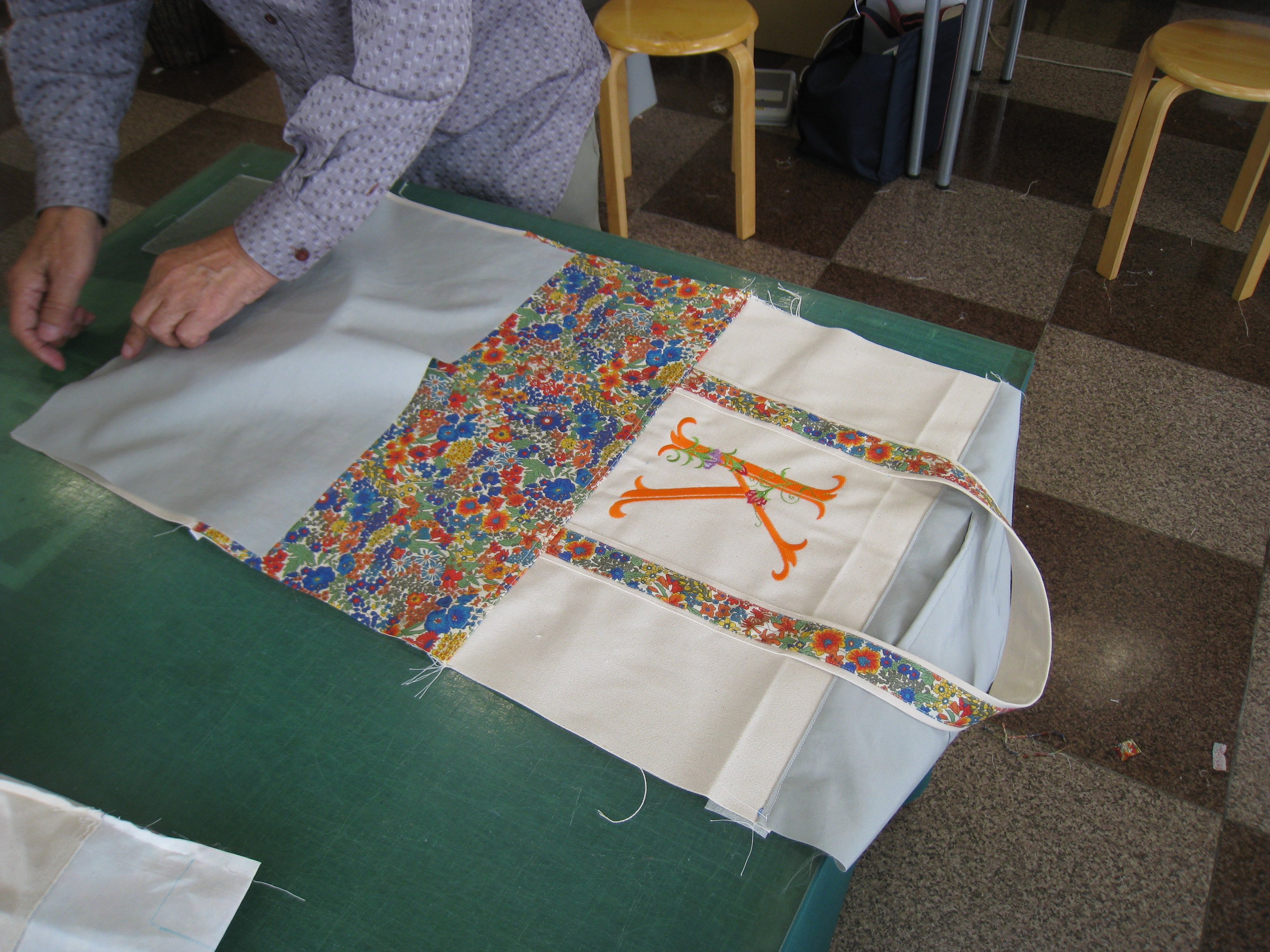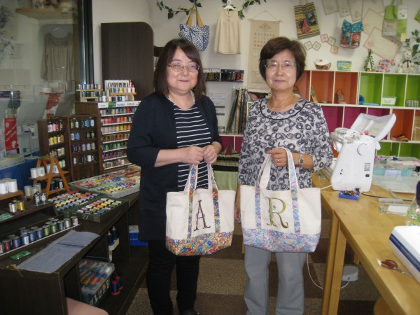 この特別講習会は、帆布に花柄のアルファベットを刺しゅうして、リバティ生地をアクセ