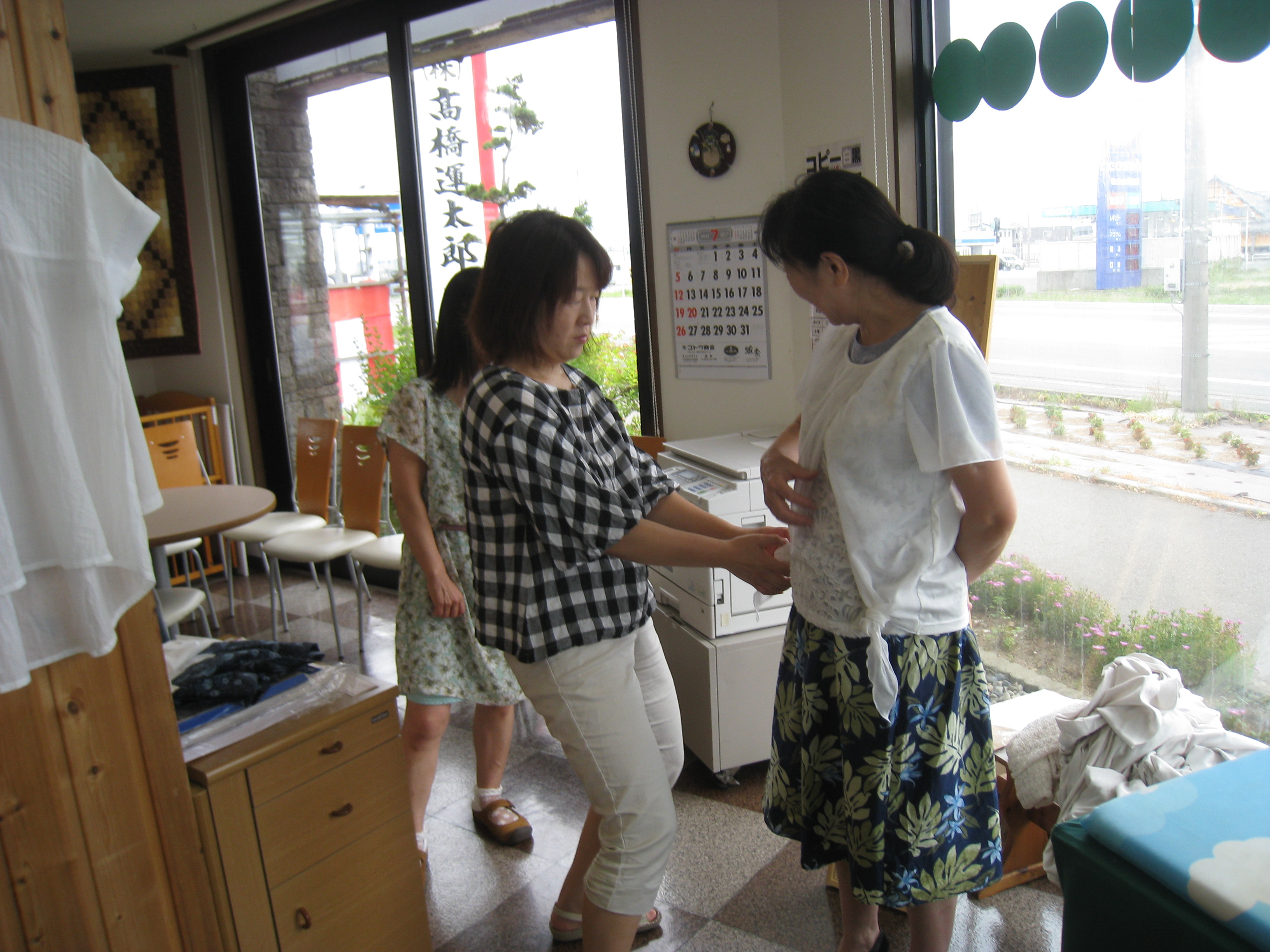 ゆみさんが作成途中のブラウスを上西さんから試着してもらい、見た目やバランスの