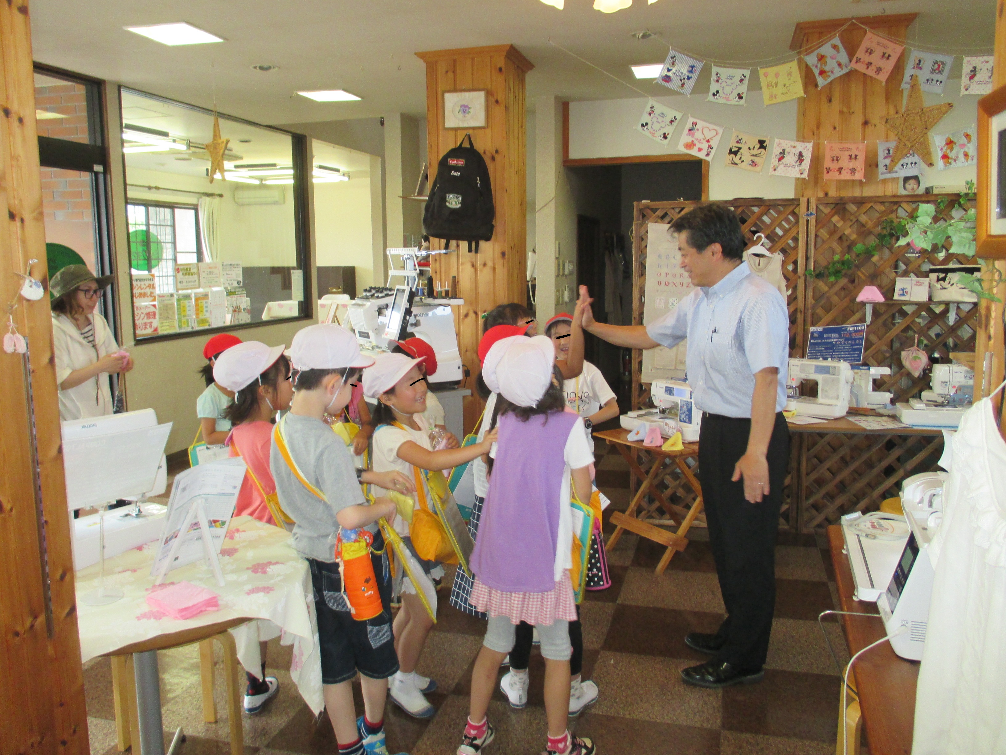 16人が『町探検』ということで当店に来店。今までミシン屋さんに入ったことがないと