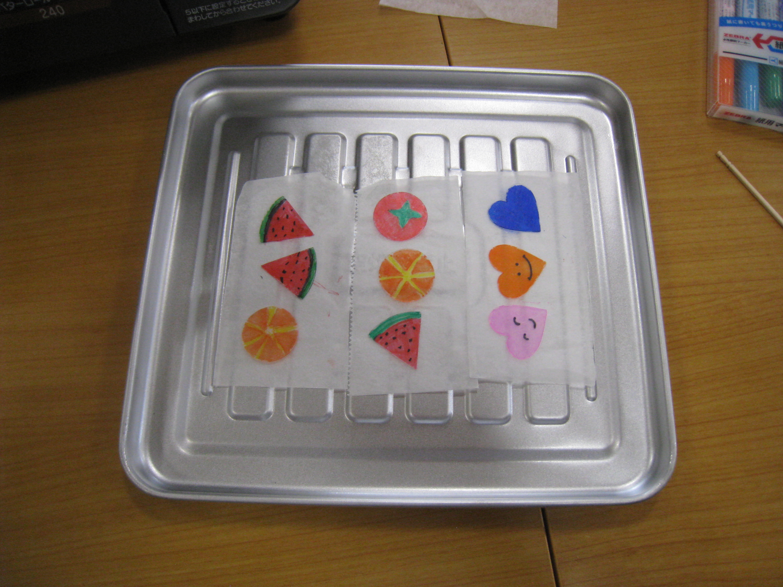 貝などの形にカットしてそこに色を塗り、オーブンで焼き、UVレジンを塗り固めると