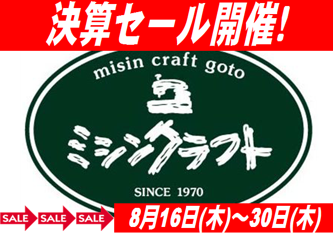 「決算セール」開催のお知らせ2018年08月10日更新イベント情報 Day:平成30年8月16日(木)~30日(木)Time:AM9:30~PM7:00決算セールのご案内です。 決算セール限定のオススメミシンでは、1万円相当の別売りアクセサリーをプレゼント! 他にも実用ミシンからロックミシン・職業用ミシンまで全品決算セール特価でおまちしております。