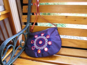 カットワーク刺しゅうを使い、中にミラーを入れたショルダータイプのポシェットです。