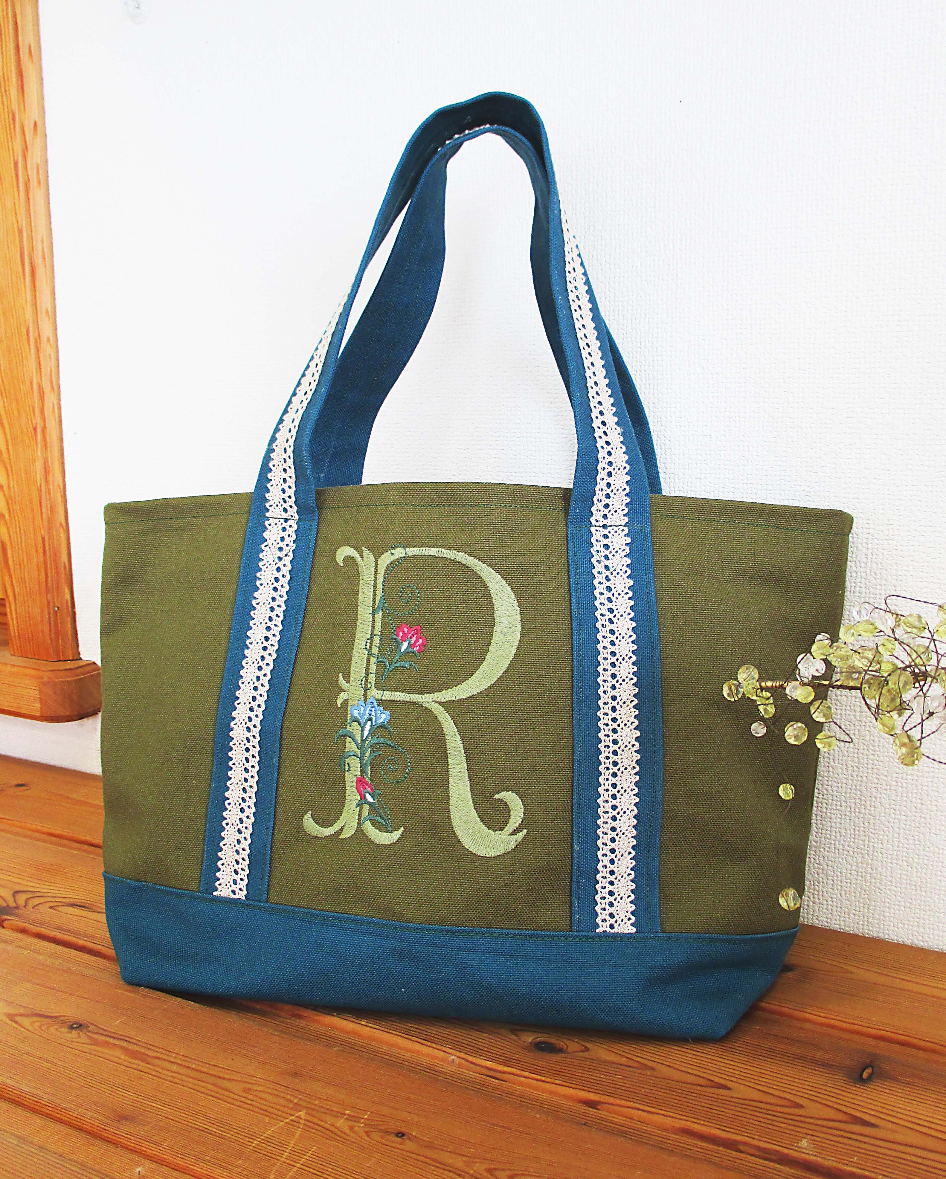 「ビンテージ帆布」に大型の刺しゅうを施したトートバッグです。