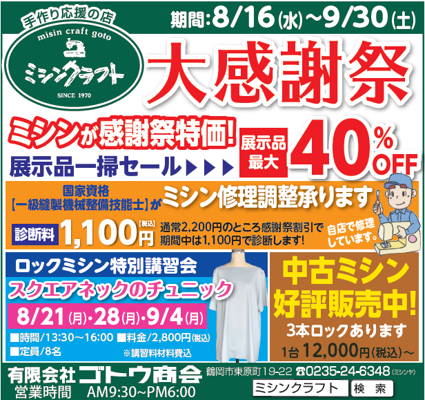 「大感謝祭」開催中!2023年08月17日更新イベント情報 Day:令和5年8月16日(水)~9月30日(土)Time:9:30~18:00只今、ミシンクラフトでは「大感謝祭」を開催しております! ブラザー・JUKI・ジャノメ・ベビーロック等、各メーカーミシンを感謝祭特価で! 他にも展示品が最大40%OFF!の「展示品一掃セール」や厳選し整備したコンピュータミシン・ロックミシンをご提供する「中古ミシンセール」も同時開催中です! 期間中、ミシンの診断料を通常2,200円のところ1,100円で診断しております。ミシンの調子が気になっていた方も是非この機会にミシンクラフトへ! ご来店お待ちしております。