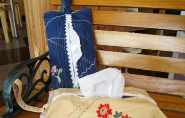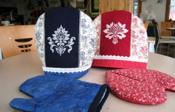ブラザー販売より講師を迎えての特別講習会2日目です。中央の刺しゅうが素敵なティーコゼー。内側には保温性能の高い生地が使われていて、とても実用的な印象です。写真のどちらかの色をキッチンミトンとセットで作ります。