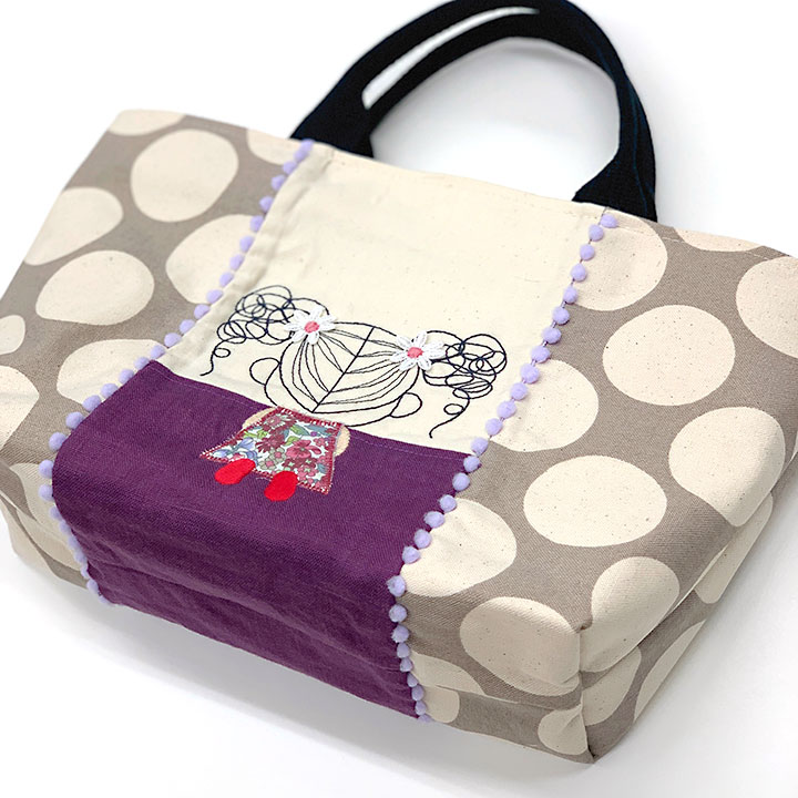 In The hoop技法を利用して刺しゅう枠内でメインになる女の子の表裏を仕上げます。 【出来上がりサイズ】タテ20cm×ヨコ26cm×マチ10cm ※定員に達し次第締め切りとさせていただきますので、お早めにお申し込みください。